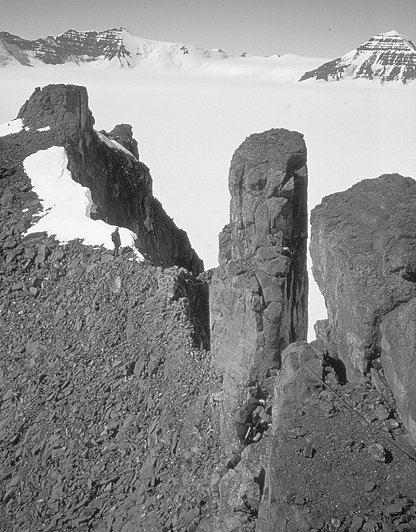 The peaks of the Lindberghs were totally different to the Lemons – many were straightforward snow (or even ski) ascents. My most memorable peak in the Lindberghs was RJ’s Peak. We skied most of the way up this mountain, and walked when the going became too steep. The summit offered wonderful views of the area, and we could see the spiky peaks of the Lemons in the distance (I think we all secretly missed them, even though we’d only been away from them for five days). It was bitter cold and there was a brittle wind on top – the Lindberghs were noticeably colder than the relatively tropical Lemons. Our descent involved a long ski along the top ridge of the mountain, and an interesting route down a steep crevasse field. Jim, in safe mountain-rescue mode, bristled at the latter while Dan got around the problem by doing the fastest bum-slide ever recorded. There was another short section of holes to negotiate…Dan was trailing behind and still hadn’t appeared after half an hour of waiting and whistling/yelling. We eventually found him looking sheepish at the bottom – he’d found another route down. Crumbly crumbly Lindberghs |