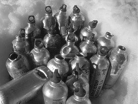Outer case packaging. We used 70x40x40 triply corrugated cardboard boxes, banded shut with a banding machine hired from HSS hire (tensioned plastic bands closed with metal crimps). We also dropped two plastic barrels for melting water in and a plywood box for cooking on.In 1999 we dropped all our food and equipment in 50L plastic barrels, however they are not as rigid as the cardboard boxes, so we ended up with more broken food and equipment. The sides of the drum get pushed in easily, crushing the contents. Plywood boxes work as well as the cardboard boxes, however they are heavier. Packing Order. It is important to fill each barrel with items of similar density and hardness. We dropped barrels completely full of fragile biscuits and hardly any broke. In comparison the jam exploded horribly against the tins. |