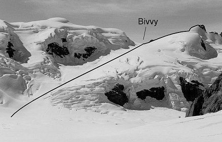 From the col behind the Steeple and in front of the Beacon, ascend the crevassed snowfield to the right hand shoulder of the Beacon. The attempt was abandoned at this point due to bad weather, and because