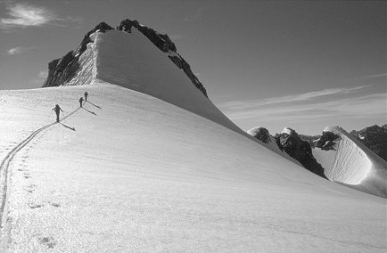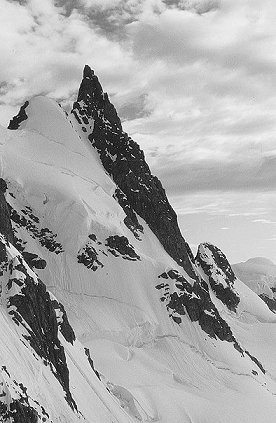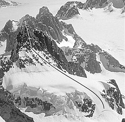 Approach from SE through large crevasse field. Head up obvious large snow gully to col, 45° . Trend right up smaller gully to short rock step leading to summit block. Descent is reverse of ascent (no abseiling necessary).