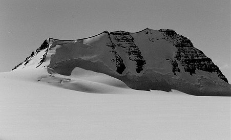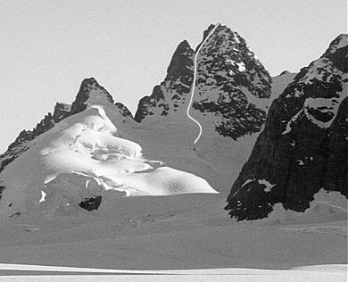 Above: Solstice and Bell viewed from South East on Chisel Glacier Left: French’s Peak (from West), with Cathedral (far LHS) and Coxcombe (rock pyramid in centre) |