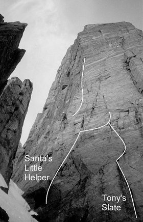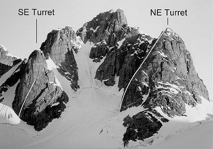 First Ascent of Trident in 1993 by Lower, Ferguson. NE Couloir/E Ridge, TD