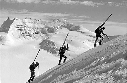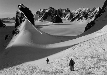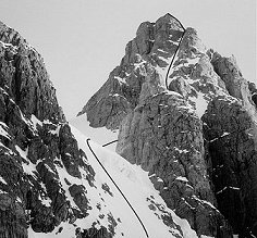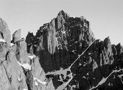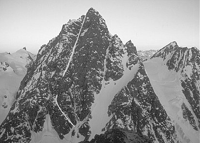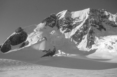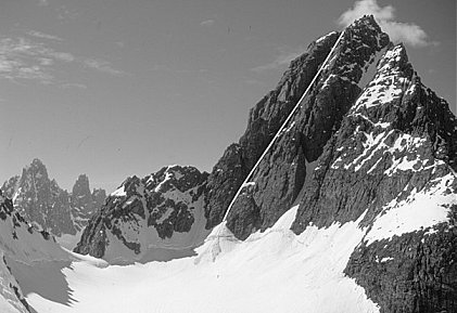 Ascend large snow face on S face of mountain to highest right-trending snow gully that leads to col on E ridge. Eight pitches of rock up to V- lead to level summit ridge (keep to right of broad ridge, finally traversing left, just below level summit ridge). Six pitches along summit ridge on rock to IV- lead to final snow pitch to summit. Descent route is reverse of ascent (5 abseils). Carrying axes, plastic boots and crampons to summit ridge is advisable, to allow quicker traverse on snow/ice to summit. |