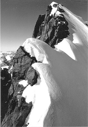 Climb the snow shoulder N of the mountain to access the end of the NE ridge (summit ridge). Traverse the summit ridge to a rock summit. Abseil or down-climb a 25m rock step. Climb the rock step opposite (IV-, 12m) and continue along the snow ridge to summit. Descent is reverse of ascent with one abseil at rock step
