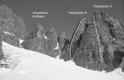 Above: The Haystooks from Chisel Glacier. Below: Routes on Haystooks Buttress