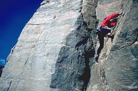 The party got about halfway up the face, pretty much climbing at their limit. The way ahead looked possible to climb, but if anything a bit harder, so they "quit while they were ahead". The descent involved two abseils down the same line.
