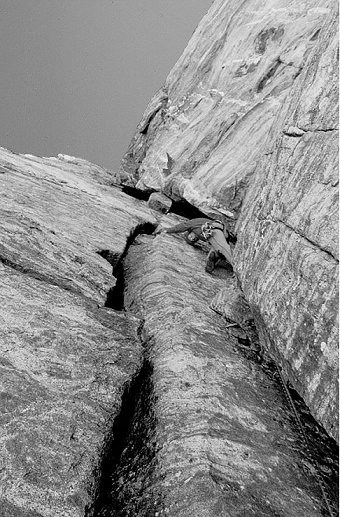 The route follows the straight ‘left-to-right’ slanting crack in the middle of the face starting at its origin on the left.