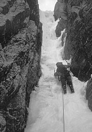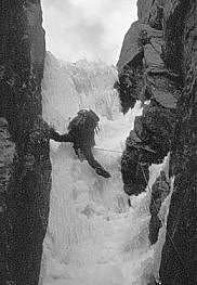 Cross the bergshrund and approach the ramp line which trends left on neve and mixed ground (III) crossing an ‘airy’ corner. Climb the chimney direct on water ice taking belays on the left wall (the two main pitches being V, 5 and IV, 5). Continue on 45/50° neve up the open couloir until a short ice step is reached. Ascend this and take two pitches on 50° hard ice (III) before breaking right up a small chimney and entertaining mixed ground. A single pitch leads to the summit at IV.