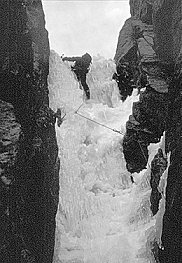 For descent, abseil line of ascent to base of chimney. Two further abseils straight down lead to snow slope. Bergshrund was also ‘abbed’ on first ascent.