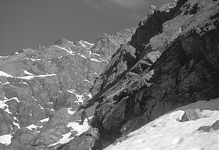 Steeple. Rupert on snow ramp, below main gully |