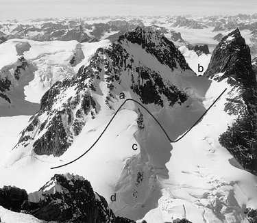 Beacon (Left) and Watchtower (Right) taken from Steeple. Attepted lines via ‘a’ and ‘c’ failed due to large crevasses. Reaching col ‘b’ via a traverse behind Beacon looked long and difficult Suggested route is via ‘d’ or near ‘c’ |